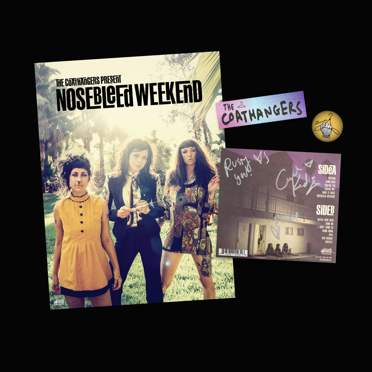 April 15, 2021, marks the 5th birthday of The Coathangers' phenomenal fifth album, Nosebleed Weekend! To celebrate, we're offering a limited edition Nosebleed Weekend bundle that includes an autographed CD, 18"x24" folded poster, a rectangle glitter sticker, and a 2.25" metallic button. Please act fast as the bundle is limited to 50!